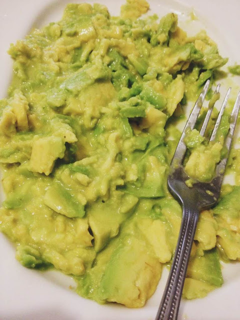 Ahora, en un plato aparte, vas a cortar los aguacates en tajadas y majarlos con un tenedor. Perfectamente puedes usar un procesador de comida, pero para mí es mejor hacerlo con un tenedor, se le da más amor al aguacate 🙂