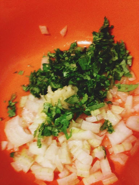 Después vas a quitarle las hojas a los tallos de menta y cilantro y picarlas bien pequeñitas.