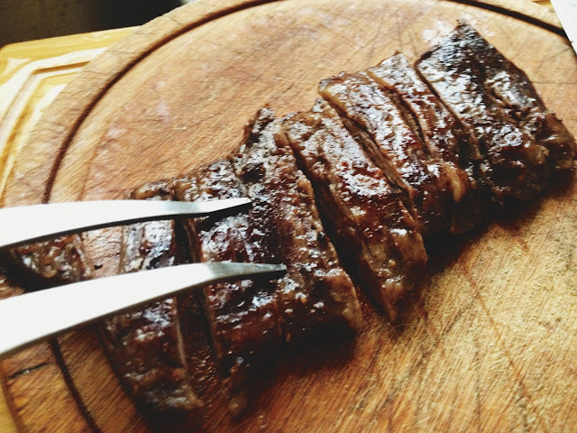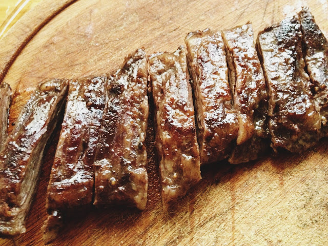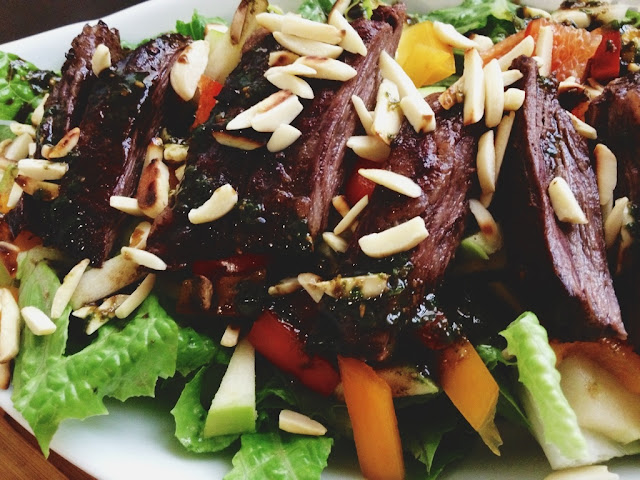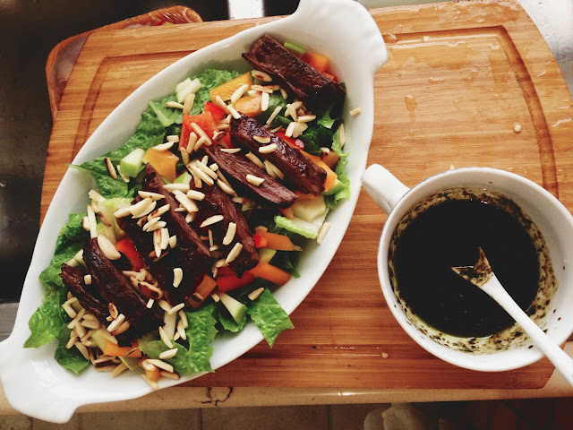 Muchas veces me encuentro con la tarea de hacer almuerzo para mí y para mi madre, ayer fue uno de esos días. Cuando desperté ya ella había ido al supermercado y encontré unos bellísimos cortes de churrasco y unos que otros vegetales frescos, la inspiración me tocó el cerebro y decidí hacer una ensalada de churrasco.