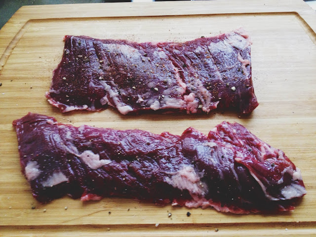 Para empezar, condimenté el churrasco con sal y pimienta (de ambos lados) y una pizca de canela de un lado. La canela es opcional, esto es un condimento que me gusta ponerle porque le da un sabor muy interesante.
