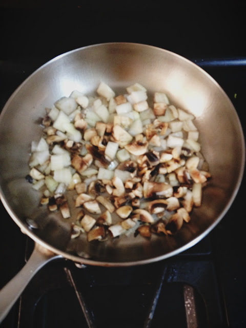 Primero puse a sofreír hasta en mantequilla y aceite de oliva la cebolla y los champiñones.