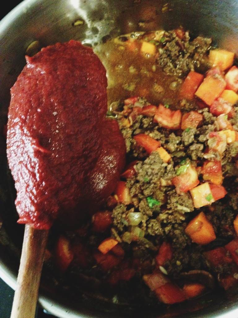 Después vas a agregarle las dos latas de tomates en cubos, la zanahoria, el limón, el cilantro picado y la cucharada de pasta de tomate.