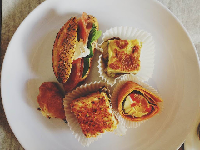 Bollito de hojaldre relleno de ricotta, sandwich de salami genoa, queso camembert y rúcula, mini tortilla española, rollo de pimientos y queso camambert, carrot cake.