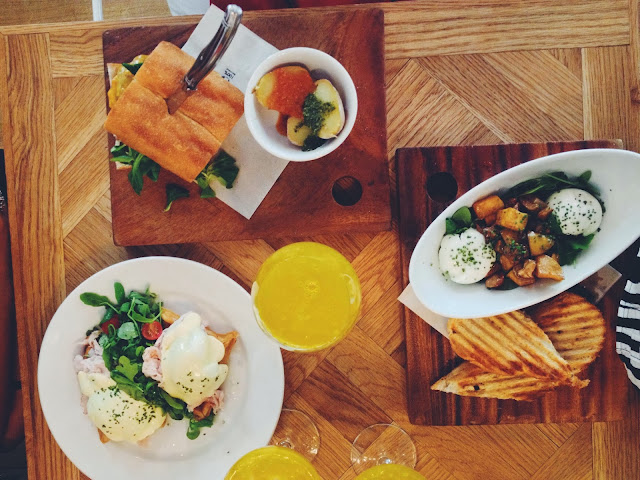 Derecha: Breakfast combo; Sandwich de higos y queso Brie, Ensalada de rúcula, peras, manzanas, setas y dos huevos escalfados. (Obviamente mi plato.)