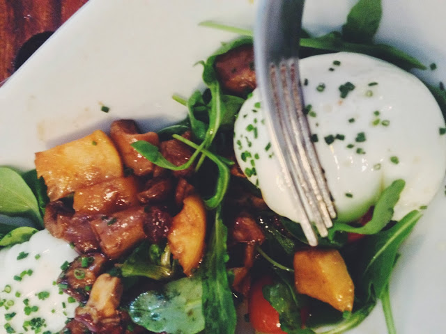Derecha: Breakfast combo; Sandwich de higos y queso Brie, Ensalada de rúcula, peras, manzanas, setas y dos huevos escalfados. (Obviamente mi plato.)