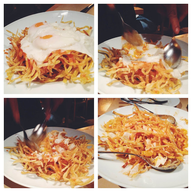 Y mi segundo favorito, “Huevos cabreados”, son papas super crujientes con dos huevos escalfados por encima, la/el mesero viene a la mesa y lo mezcla por ti, la yema de los huevos hace una riquísima salsa que adereza las papas y bueno…esto es algo que me comería cada día que tenga resaca, es la mezcla perfecta, estoy enamorada.